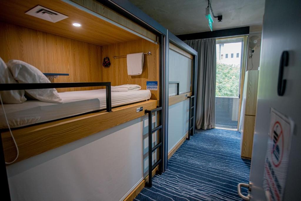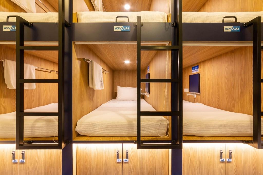 Each pod is air-conditioned, comes with high-grade mattresses and pillows, and roller blinds for privacy. Shared bathrooms and showers are outside the dorm/pod rooms. Lockers, security systems (CCTV, secure access), and amenities like hairdryers are provided.
